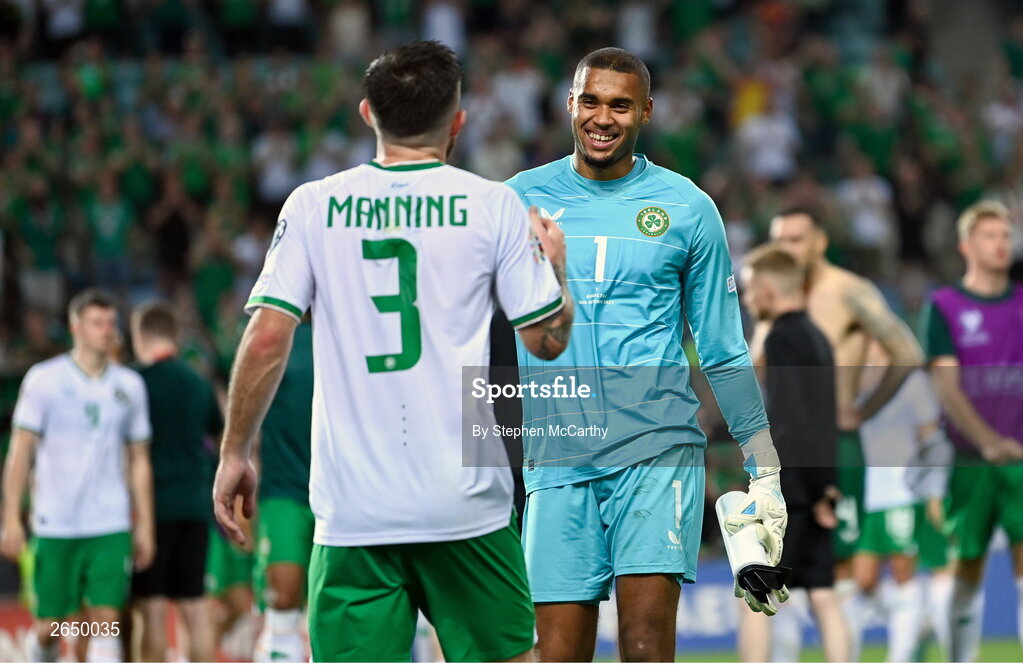 16 October 2023; Republic of Ireland goalkeeper Gavin Bazunu celebrates with Ryan Manning after the UEFA EURO 2024 Championship qualifying group B match between Gibraltar and Republic of Ireland at Estádio Algarve in Faro, Portugal. Photo by Stephen McCarthy/Sportsfile