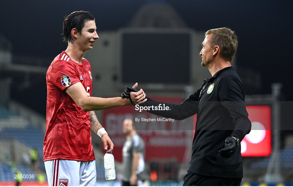 16 October 2023; Louie Annesley of Gibraltar with Republic of Ireland chartered physiotherapist Danny Miller after the UEFA EURO 2024 Championship qualifying group B match between Gibraltar and Republic of Ireland at Estádio Algarve in Faro, Portugal. Photo by Stephen McCarthy/Sportsfile