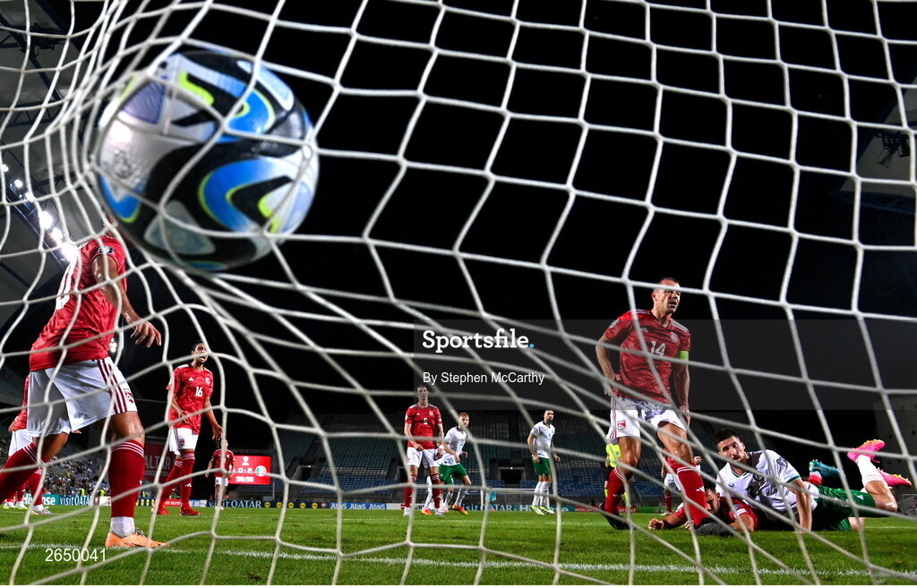 16 October 2023; Matt Doherty of Republic of Ireland scores his side's third goal during the UEFA EURO 2024 Championship qualifying group B match between Gibraltar and Republic of Ireland at Estádio Algarve in Faro, Portugal. Photo by Stephen McCarthy/Sportsfile