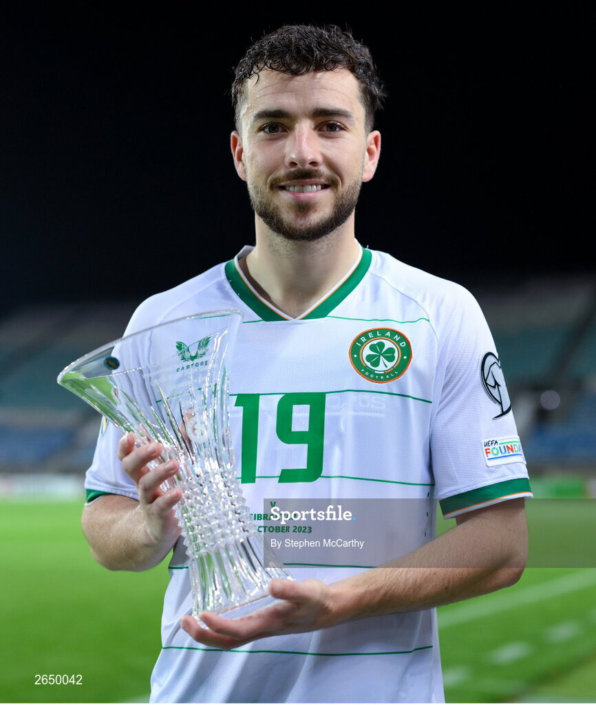16 October 2023; Mikey Johnston of Republic of Ireland with his Carlsberg Player of the Match award after the UEFA EURO 2024 Championship qualifying group B match between Gibraltar and Republic of Ireland at Estádio Algarve in Faro, Portugal. Photo by Stephen McCarthy/Sportsfile
