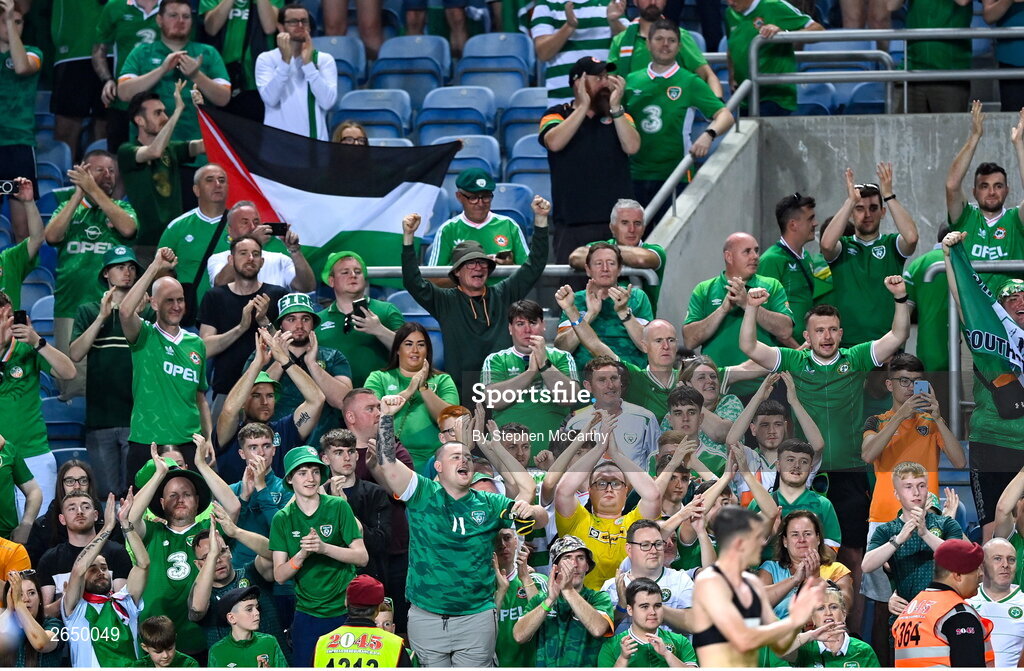 16 October 2023; Republic of Ireland supporters celebrate after the UEFA EURO 2024 Championship qualifying group B match between Gibraltar and Republic of Ireland at Estádio Algarve in Faro, Portugal. Photo by Stephen McCarthy/Sportsfile