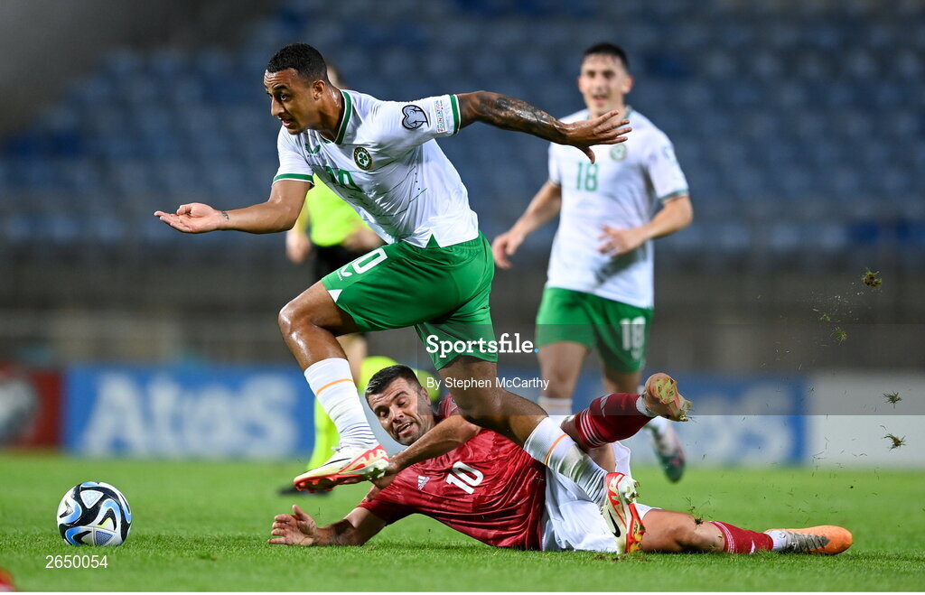 16 October 2023; Adam Idah of Republic of Ireland and Liam Walker of Gibraltar during the UEFA EURO 2024 Championship qualifying group B match between Gibraltar and Republic of Ireland at Estádio Algarve in Faro, Portugal. Photo by Stephen McCarthy/Sportsfile