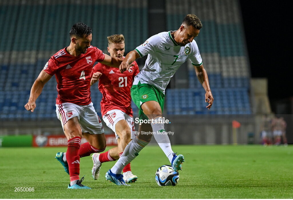 16 October 2023; Callum Robinson of Republic of Ireland in action against John Sergeant, left, and Jamie Coombes of Gibraltar during the UEFA EURO 2024 Championship qualifying group B match between Gibraltar and Republic of Ireland at Estádio Algarve in Faro, Portugal. Photo by Stephen McCarthy/Sportsfile