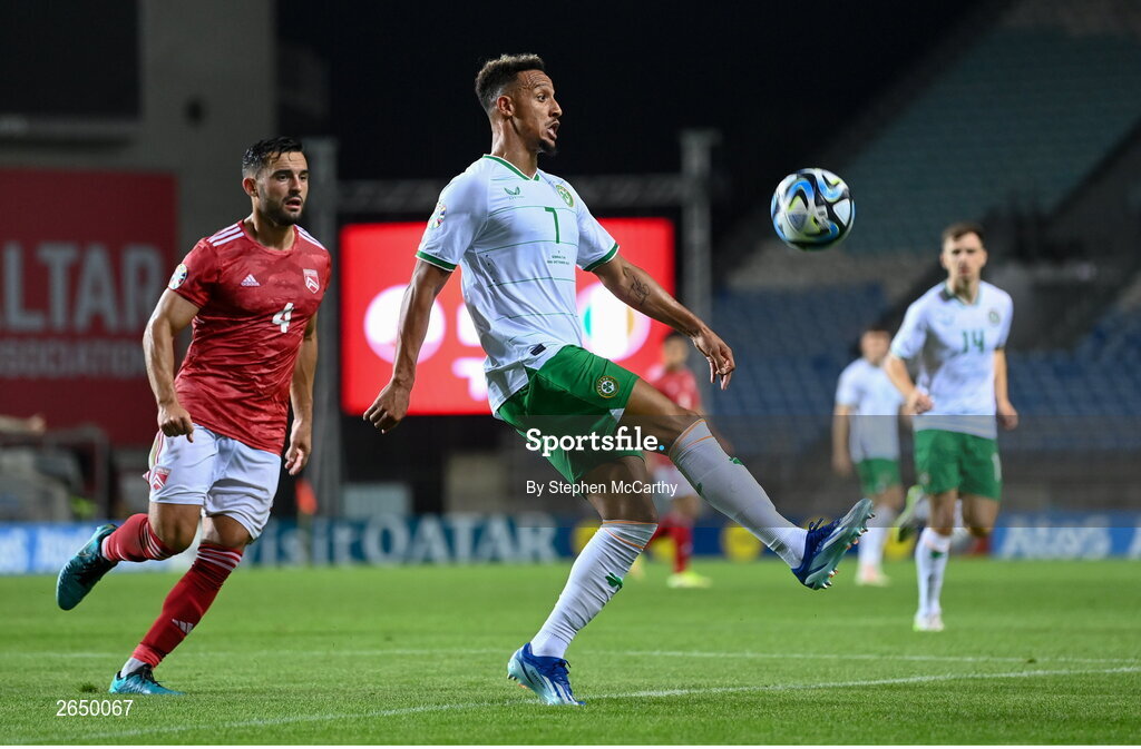 16 October 2023; Callum Robinson of Republic of Ireland and John Sergeant of Gibraltar during the UEFA EURO 2024 Championship qualifying group B match between Gibraltar and Republic of Ireland at Estádio Algarve in Faro, Portugal. Photo by Stephen McCarthy/Sportsfile