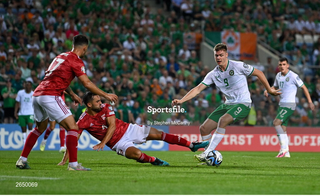 16 October 2023; Evan Ferguson of Republic of Ireland in action against John Sergeant of Gibraltar during the UEFA EURO 2024 Championship qualifying group B match between Gibraltar and Republic of Ireland at Estádio Algarve in Faro, Portugal. Photo by Stephen McCarthy/Sportsfile