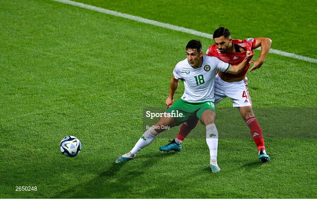16 October 2023; Jamie McGrath of Republic of Ireland in action against John Sergeant of Gibraltar during the UEFA EURO 2024 Championship qualifying group B match between Gibraltar and Republic of Ireland at Estádio Algarve in Faro, Portugal. Photo by Seb Daly/Sportsfile