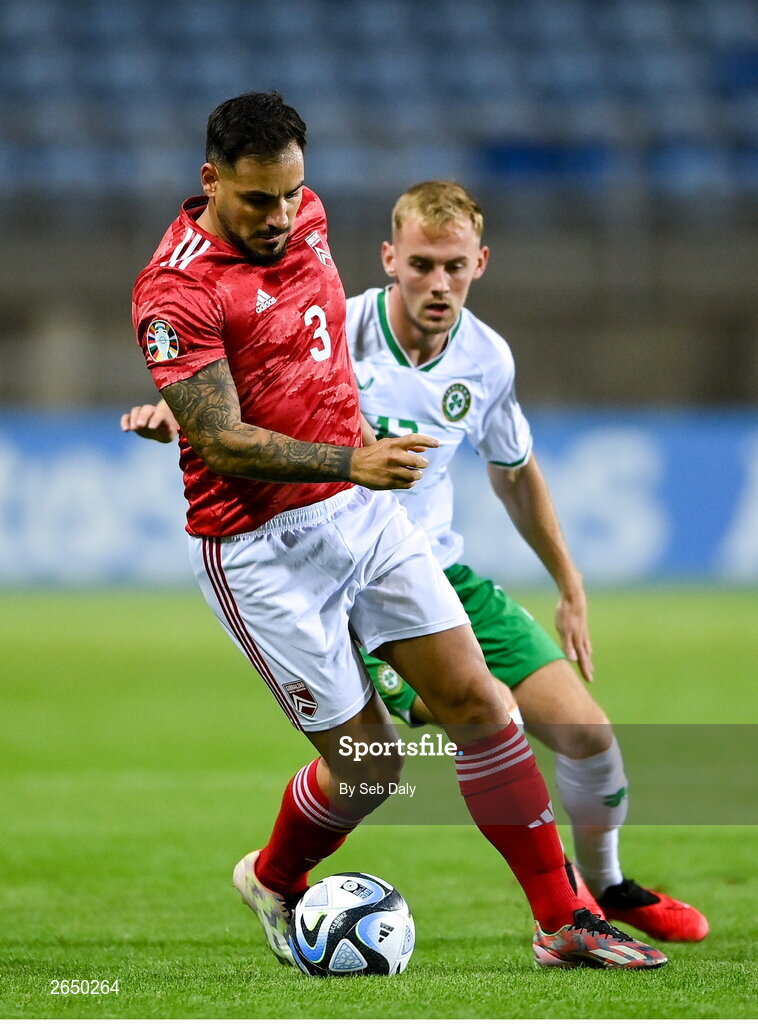 16 October 2023; Joseph Chipolina of Gibraltar in action against Mark Sykes of Republic of Ireland during the UEFA EURO 2024 Championship qualifying group B match between Gibraltar and Republic of Ireland at Estádio Algarve in Faro, Portugal. Photo by Seb Daly/Sportsfile