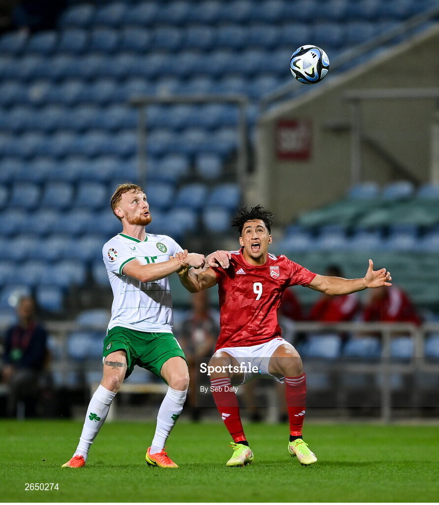 16 October 2023; Liam Scales of Republic of Ireland and Ayoub El Hmidi of Gibraltar during the UEFA EURO 2024 Championship qualifying group B match between Gibraltar and Republic of Ireland at Estádio Algarve in Faro, Portugal. Photo by Seb Daly/Sportsfile