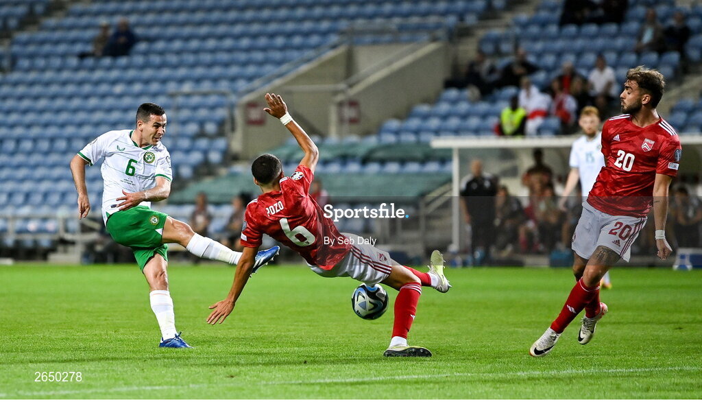 16 October 2023; Josh Cullen of Republic of Ireland in action against Nicholas Pozo, left, and Ethan Britto of Gibraltar during the UEFA EURO 2024 Championship qualifying group B match between Gibraltar and Republic of Ireland at Estádio Algarve in Faro, Portugal. Photo by Seb Daly/Sportsfile