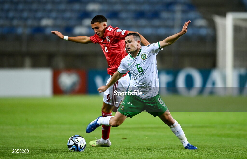 16 October 2023; Josh Cullen of Republic of Ireland in action against Nicholas Pozo of Gibraltar during the UEFA EURO 2024 Championship qualifying group B match between Gibraltar and Republic of Ireland at Estádio Algarve in Faro, Portugal. Photo by Seb Daly/Sportsfile