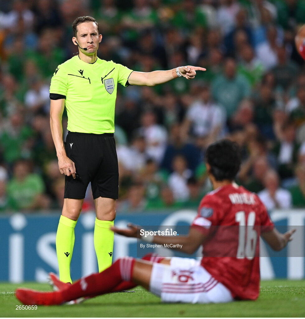 16 October 2023; Referee Christian-Petru Ciochirca during the UEFA EURO 2024 Championship qualifying group B match between Gibraltar and Republic of Ireland at Estádio Algarve in Faro, Portugal. Photo by Stephen McCarthy/Sportsfile