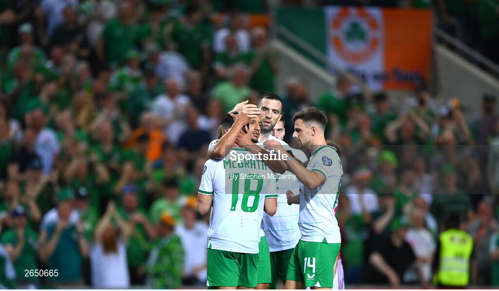 16 October 2023; Callum Robinson of Republic of Ireland is congratulated by team-mates, from left, Jamie McGrath, 18, Shane Duffy and Jayson Molumby after scoring their side's fourth goal during the UEFA EURO 2024 Championship qualifying group B match between Gibraltar and Republic of Ireland at Estádio Algarve in Faro, Portugal. Photo by Stephen McCarthy/Sportsfile
