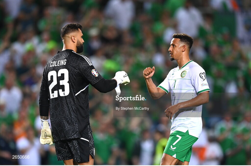 16 October 2023; Callum Robinson of Republic of Ireland and Gibraltar goalkeeper Dayle Coleing after the UEFA EURO 2024 Championship qualifying group B match between Gibraltar and Republic of Ireland at Estádio Algarve in Faro, Portugal. Photo by Stephen McCarthy/Sportsfile