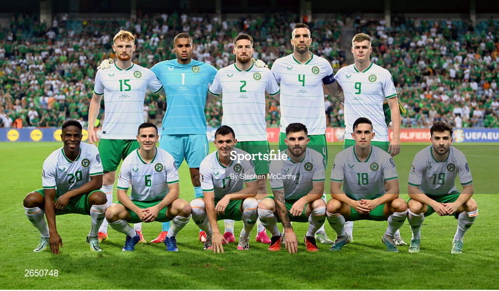 16 October 2023; The Republic of Ireland team, back row, from left, Liam Scales, goalkeeper Gavin Bazunu, Matt Doherty, Shane Duffy and Evan Ferguson, with, front row, Chiedozie Ogbene, Josh Cullen, Jason Knight, Ryan Manning, Jamie McGrath and Mikey Johnston before the UEFA EURO 2024 Championship qualifying group B match between Gibraltar and Republic of Ireland at Estádio Algarve in Faro, Portugal. Photo by Stephen McCarthy/Sportsfile