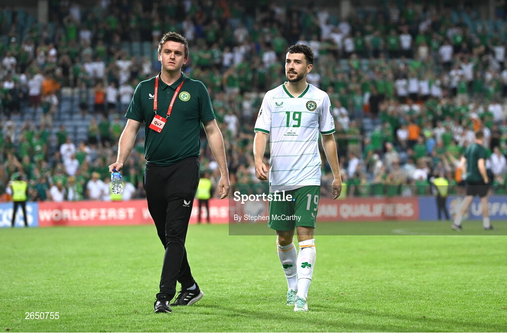 16 October 2023; Mikey Johnston of Republic of Ireland and FAI communications manager Kieran Crowley after the UEFA EURO 2024 Championship qualifying group B match between Gibraltar and Republic of Ireland at Estádio Algarve in Faro, Portugal. Photo by Stephen McCarthy/Sportsfile