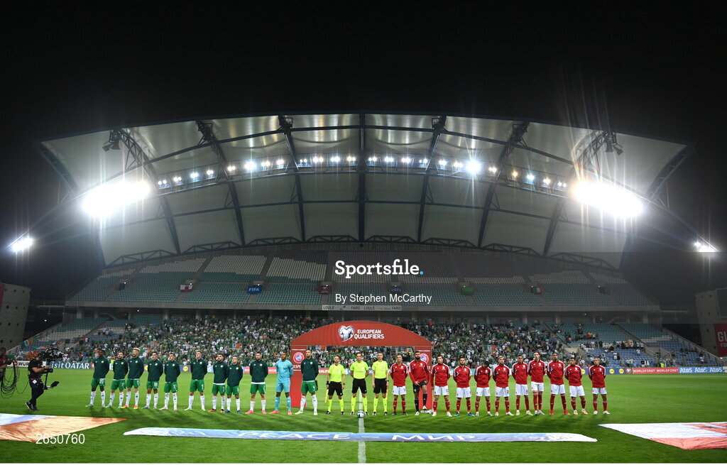 16 October 2023; A general view of Estádio Algarve as the teams and officials line up before the UEFA EURO 2024 Championship qualifying group B match between Gibraltar and Republic of Ireland at Estádio Algarve in Faro, Portugal. Photo by Stephen McCarthy/Sportsfile