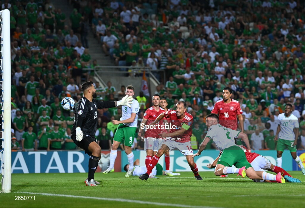 16 October 2023; Matt Doherty of Republic of Ireland heads his side's third goal past Gibraltar goalkeeper Dayle Coleing during the UEFA EURO 2024 Championship qualifying group B match between Gibraltar and Republic of Ireland at Estádio Algarve in Faro, Portugal. Photo by Stephen McCarthy/Sportsfile