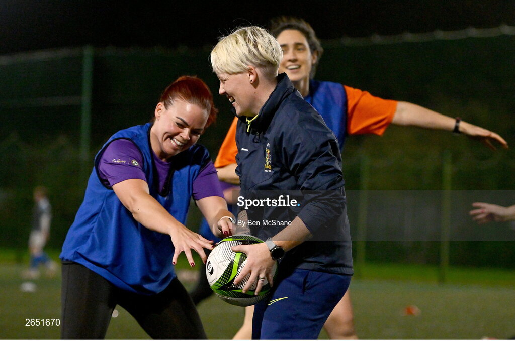 19 October 2023; Participants with coach Sarah Lloyd during the Cadbury Kick Fit session at Tullamore Town FC in Offaly. Photo by Ben McShane/Sportsfile