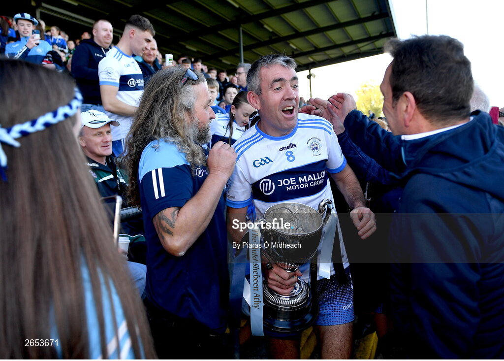 22 October 2023; Man of the match Johnny Doyle of Allenwood, 45 years old and who made his adult club football championship debut in 1996, celebrates with supporters after his side's victory in the Kildare County Intermediate Club Football Championship final between Castledermot and Allenwood at Netwatch Cullen Park in Carlow. Photo by Piaras Ó Mídheach/Sportsfile