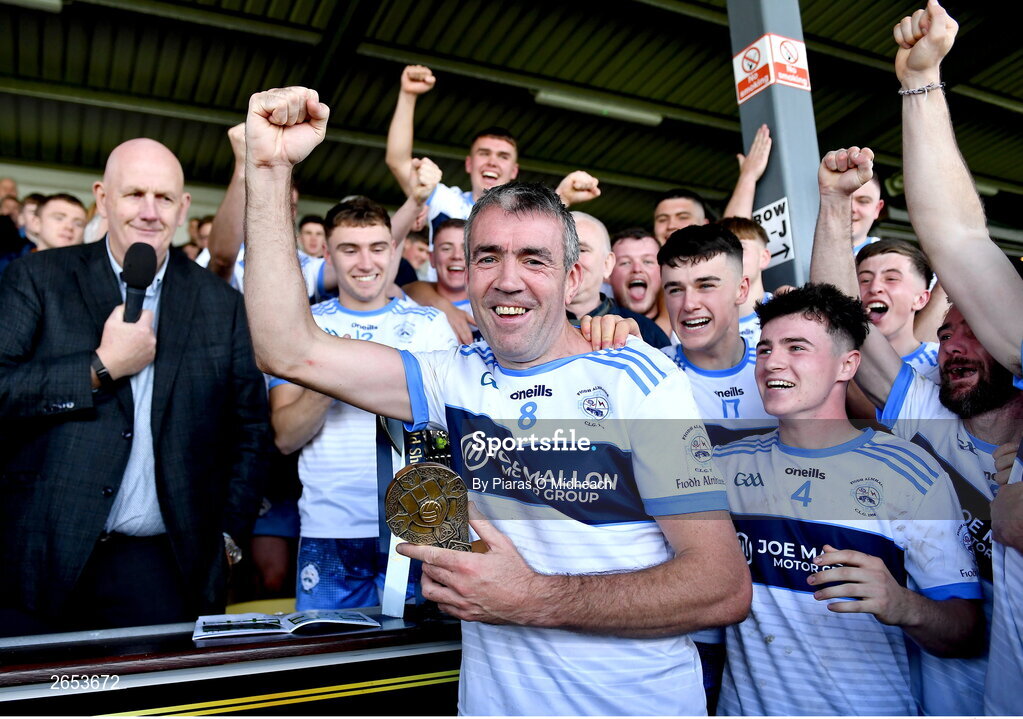 22 October 2023; Johnny Doyle of Allenwood, 45 years old and who made his adult club football championship debut in 1996, celebrates after was named as Man of the Match in his side's victory in the Kildare County Intermediate Club Football Championship final between Castledermot and Allenwood at Netwatch Cullen Park in Carlow. Photo by Piaras Ó Mídheach/Sportsfile