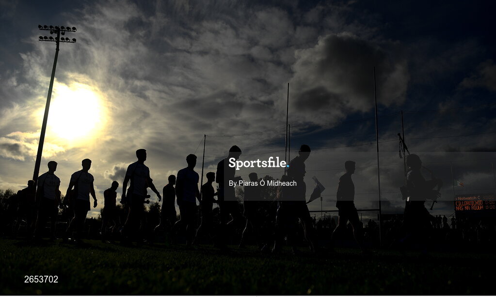 22 October 2023; Players march in the parade before the Kildare County Senior Club Football Championship final between Celbridge and Naas at Netwatch Cullen Park in Carlow. Photo by Piaras Ó Mídheach/Sportsfile