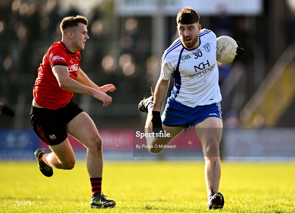 22 October 2023; Sean Hanafin of Naas in action against John Clarke of Celbridge during the Kildare County Senior Club Football Championship final between Celbridge and Naas at Netwatch Cullen Park in Carlow. Photo by Piaras Ó Mídheach/Sportsfile