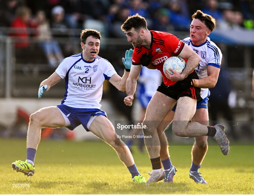 22 October 2023; Kevin Flynn of Celbridge in action against Cathal Daly, left, and Jack McKevitt of Naas during the Kildare County Senior Club Football Championship final between Celbridge and Naas at Netwatch Cullen Park in Carlow. Photo by Piaras Ó Mídheach/Sportsfile