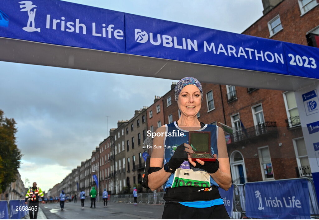 29 October 2023; The Lord Mayor's Medal Recipient Rita Casey from Mayo before the 2023 Irish Life Dublin Marathon. Thousands of runners took to the Fitzwilliam Square start line, to participate in the 42nd running of the Dublin Marathon. Photo by Sam Barnes/Sportsfile *** NO REPRODUCTION FEE **