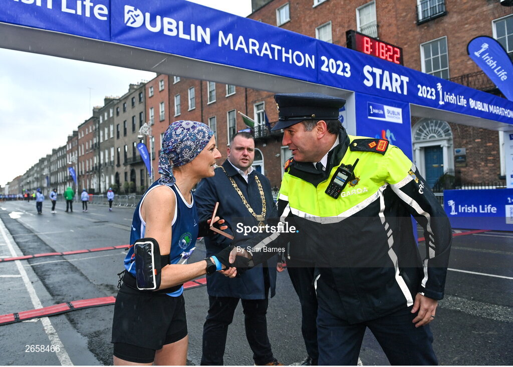 29 October 2023; The Lord Mayor's Medal Recipient Rita Casey from Mayo, left, shakes hands with Pearse Street Garda Station Superintendent Dermott McKenna before the 2023 Irish Life Dublin Marathon. Thousands of runners took to the Fitzwilliam Square start line, to participate in the 42nd running of the Dublin Marathon. Photo by Sam Barnes/Sportsfile *** NO REPRODUCTION FEE **