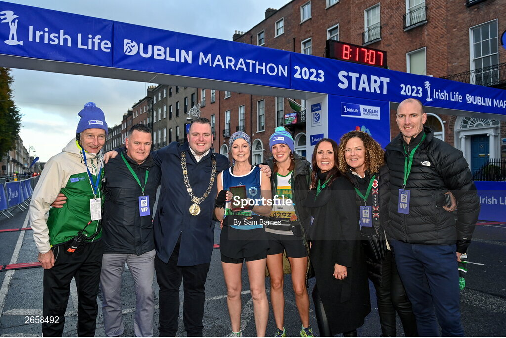 29 October 2023; Lord Mayor's Medal Recipient Rita Casey from Mayo, centre, with Lord Mayor of Dublin Cllr Daithí de Róiste, Race Director Jim Aughney, right, and friends and family before the 2023 Irish Life Dublin Marathon. Thousands of runners took to the Fitzwilliam Square start line, to participate in the 42nd running of the Dublin Marathon. Photo by Sam Barnes/Sportsfile