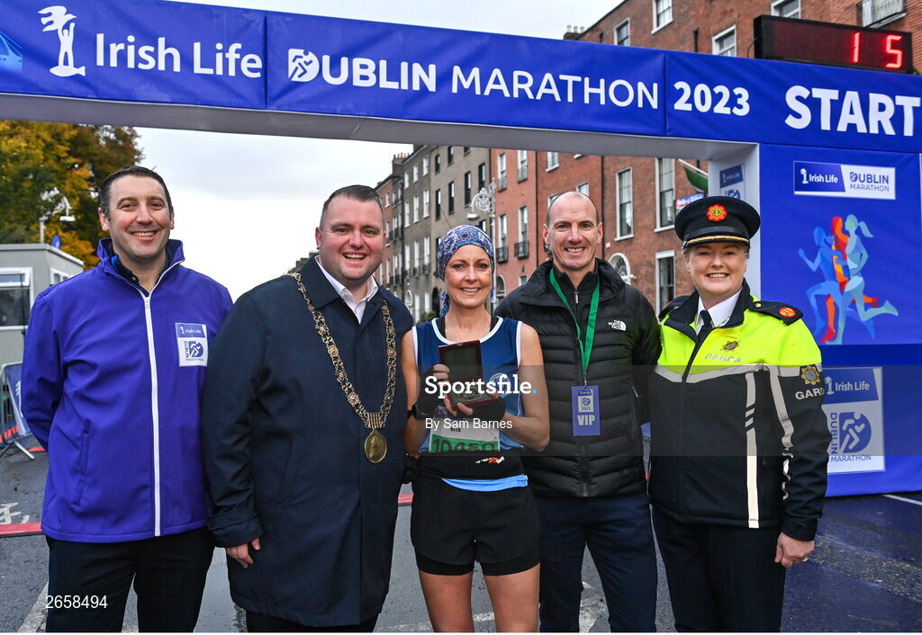 29 October 2023; Lord Mayor's Medal Recipient Rita Casey from Mayo, centre, with, from left, Irish Life CEO Declan Bolger, Lord Mayor of Dublin Cllr Daithí de Róiste, husband John Casey, and Assistant Commissioner Angela Willis before the 2023 Irish Life Dublin Marathon. Thousands of runners took to the Fitzwilliam Square start line, to participate in the 42nd running of the Dublin Marathon. Photo by Sam Barnes/Sportsfile