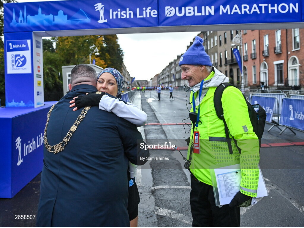 29 October 2023; Lord Mayor of Dublin Cllr Daithí de Róiste, left, Lord Mayor's Medal Recipient Rita Casey from Mayo, centre, and Race Director Jim Aughney before the 2023 Irish Life Dublin Marathon. Thousands of runners took to the Fitzwilliam Square start line, to participate in the 42nd running of the Dublin Marathon. Photo by Sam Barnes/Sportsfile