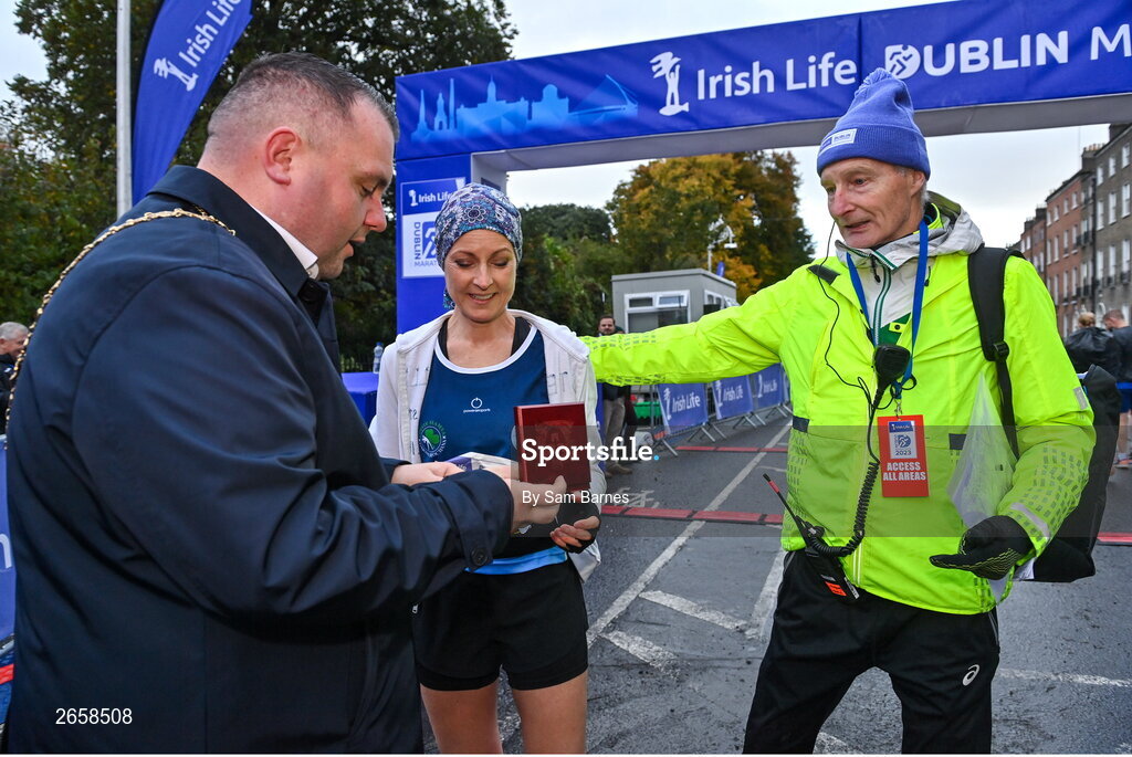 29 October 2023; Lord Mayor of Dublin Cllr Daithí de Róiste, left, Lord Mayor's Medal Recipient Rita Casey from Mayo, centre, and Race Director Jim Aughney before the 2023 Irish Life Dublin Marathon. Thousands of runners took to the Fitzwilliam Square start line, to participate in the 42nd running of the Dublin Marathon. Photo by Sam Barnes/Sportsfile