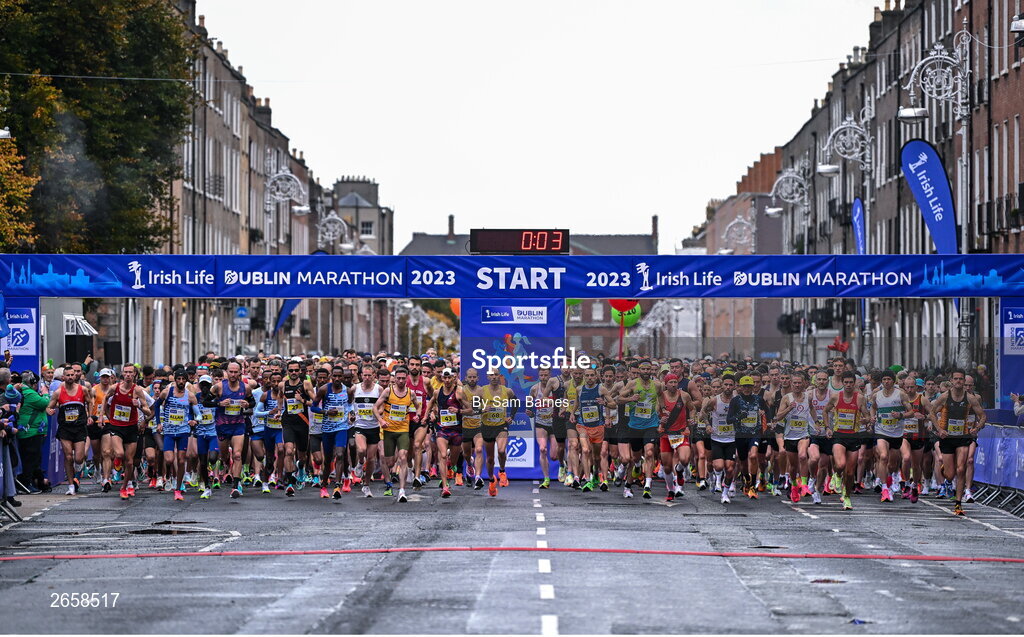 29 October 2023; The elite runners start the 2023 Irish Life Dublin Marathon. Thousands of runners took to the Fitzwilliam Square start line, to participate in the 42nd running of the Dublin Marathon. Photo by Sam Barnes/Sportsfile
