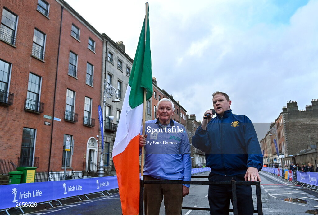 29 October 2023; The Amhran na bhFiann is sung before the 2023 Irish Life Dublin Marathon. Thousands of runners took to the Fitzwilliam Square start line, to participate in the 42nd running of the Dublin Marathon. Photo by Sam Barnes/Sportsfile