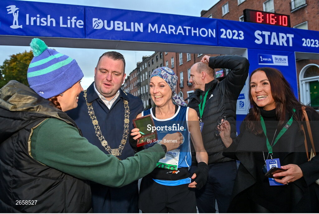 29 October 2023; Lord Mayor's Medal Recipient Rita Casey from Mayo, centre, with Lord Mayor of Dublin Cllr Daithí de Róiste, second from left, and friends and family before the 2023 Irish Life Dublin Marathon. Thousands of runners took to the Fitzwilliam Square start line, to participate in the 42nd running of the Dublin Marathon. Photo by Sam Barnes/Sportsfile