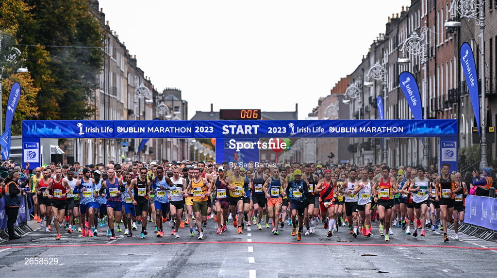 29 October 2023; The elite runners start the 2023 Irish Life Dublin Marathon. Thousands of runners took to the Fitzwilliam Square start line, to participate in the 42nd running of the Dublin Marathon. Photo by Sam Barnes/Sportsfile