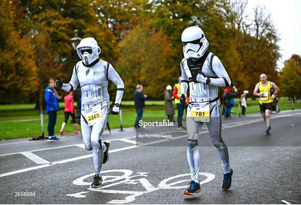 29 October 2023; Cormac O'Floinn and Simon Halpin from Dublin 15 dressed as Clone Troopers during the 2023 Irish Life Dublin Marathon. Thousands of runners took to the Fitzwilliam Square start line, to participate in the 42nd running of the Dublin Marathon. Photo by Ramsey Cardy/Sportsfile