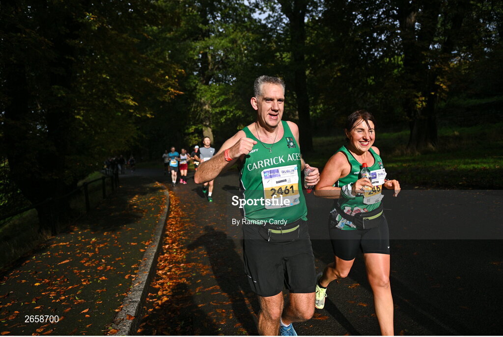 29 October 2023; Diarmuid O' Reilly and Martina McEneaney from Monaghan during the 2023 Irish Life Dublin Marathon. Thousands of runners took to the Fitzwilliam Square start line, to participate in the 42nd running of the Dublin Marathon. Photo by Ramsey Cardy/Sportsfile