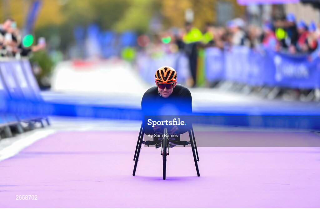 29 October 2023; Patrick Monahan from Kildare on his way to winning the wheelchair event during the 2023 Irish Life Dublin Marathon. Thousands of runners took to the Fitzwilliam Square start line, to participate in the 42nd running of the Dublin Marathon. Photo by Sam Barnes/Sportsfile