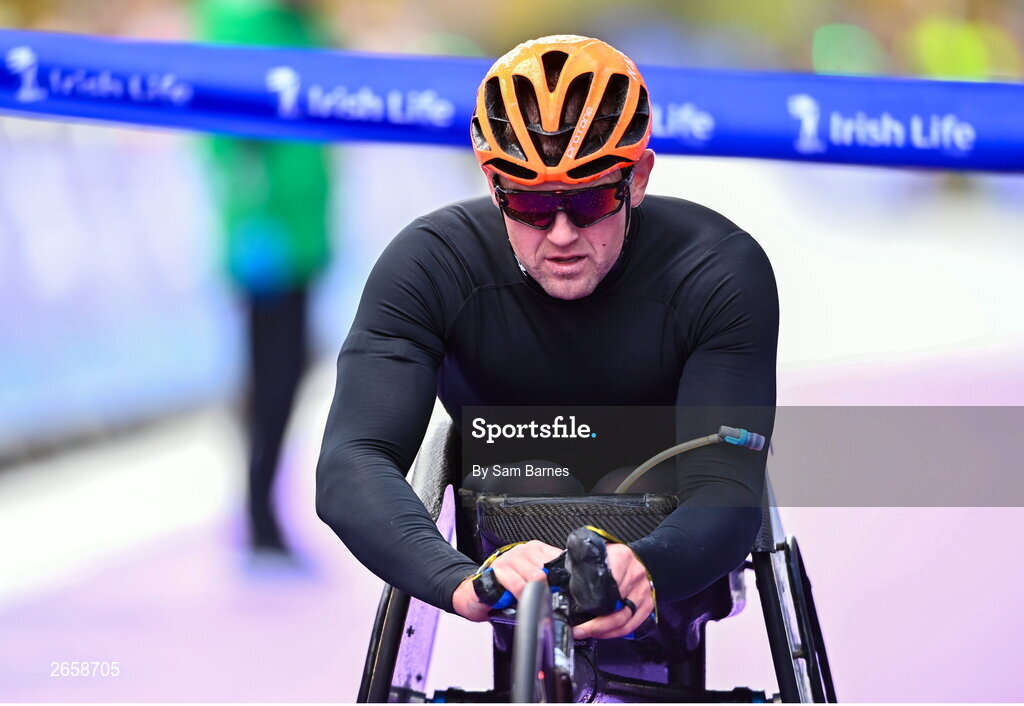 29 October 2023; Patrick Monahan from Kildare crosse the line to win the wheelchair event during the 2023 Irish Life Dublin Marathon. Thousands of runners took to the Fitzwilliam Square start line, to participate in the 42nd running of the Dublin Marathon. Photo by Sam Barnes/Sportsfile