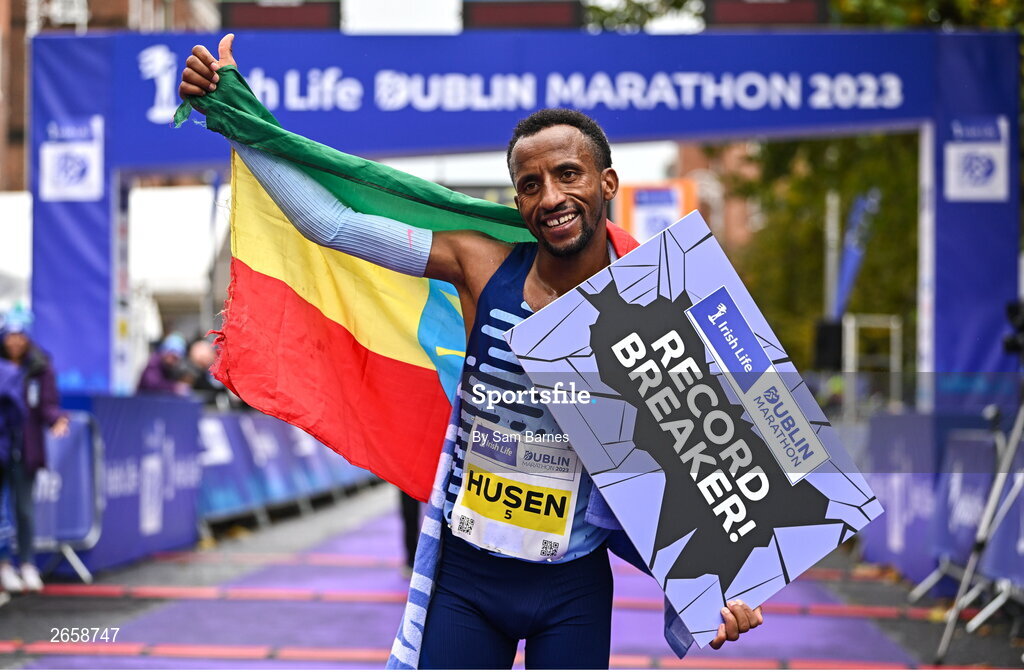 29 October 2023; Kemal Husen celebrates after winning the men's event during the 2023 Irish Life Dublin Marathon. Thousands of runners took to the Fitzwilliam Square start line, to participate in the 42nd running of the Dublin Marathon. Photo by Sam Barnes/Sportsfile