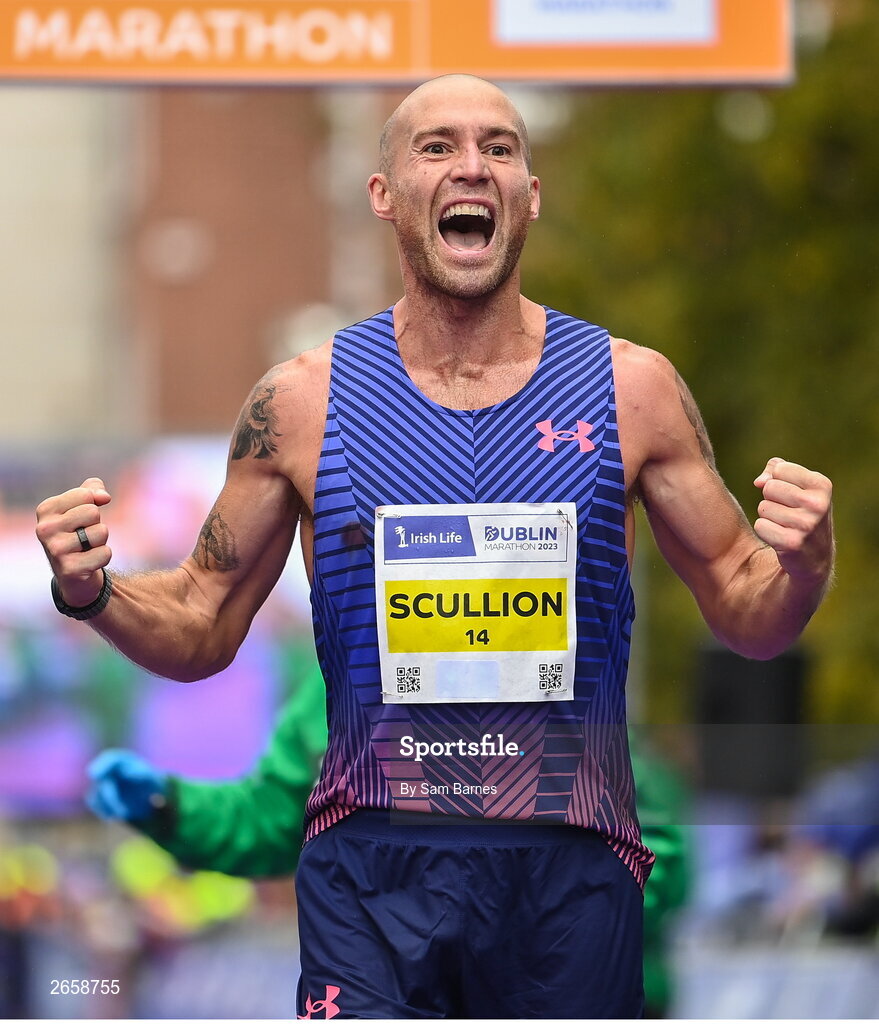 29 October 2023; Stephen Scullion celebrates as he finishes third in the men's event during the 2023 Irish Life Dublin Marathon. Thousands of runners took to the Fitzwilliam Square start line, to participate in the 42nd running of the Dublin Marathon. Photo by Sam Barnes/Sportsfile