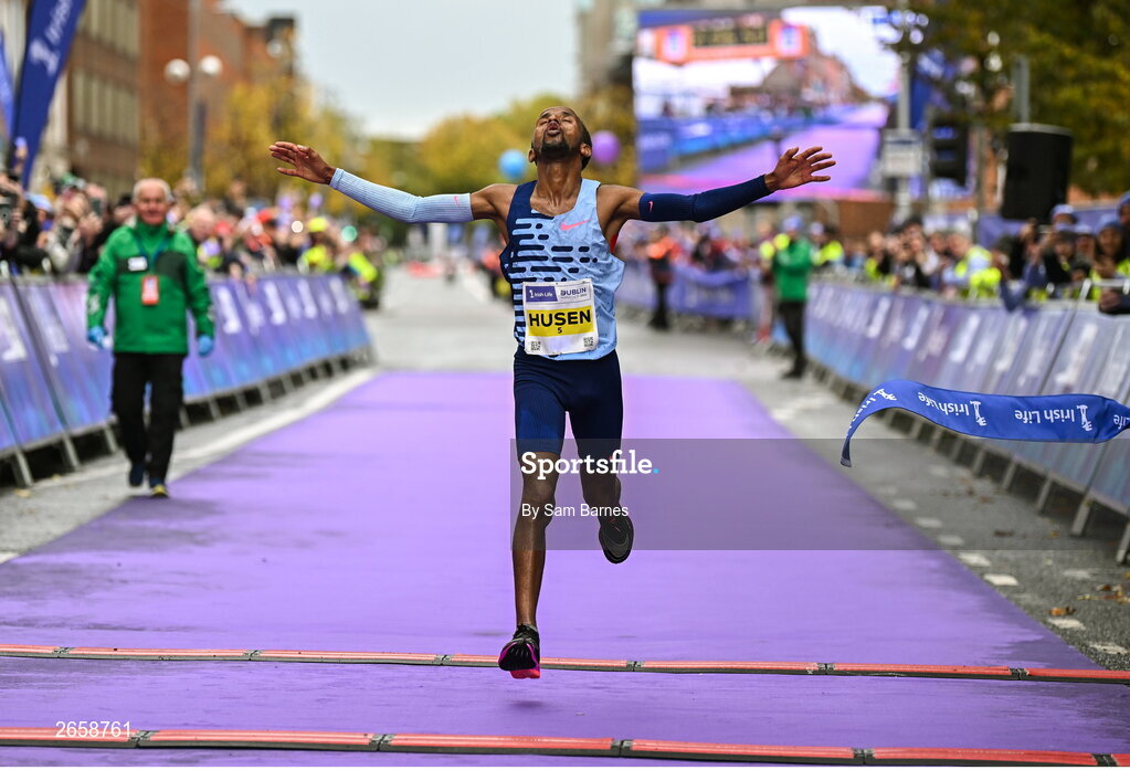 29 October 2023; Kemal Husen celebrates after winning the men's event during the 2023 Irish Life Dublin Marathon. Thousands of runners took to the Fitzwilliam Square start line, to participate in the 42nd running of the Dublin Marathon. Photo by Sam Barnes/Sportsfile