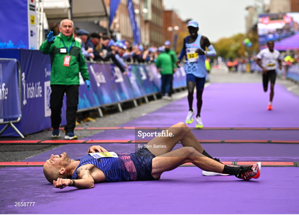 29 October 2023; Irish National Champion Stephen Scullion after he finished third in the men's event during the 2023 Irish Life Dublin Marathon. Thousands of runners took to the Fitzwilliam Square start line, to participate in the 42nd running of the Dublin Marathon. Photo by Sam Barnes/Sportsfile