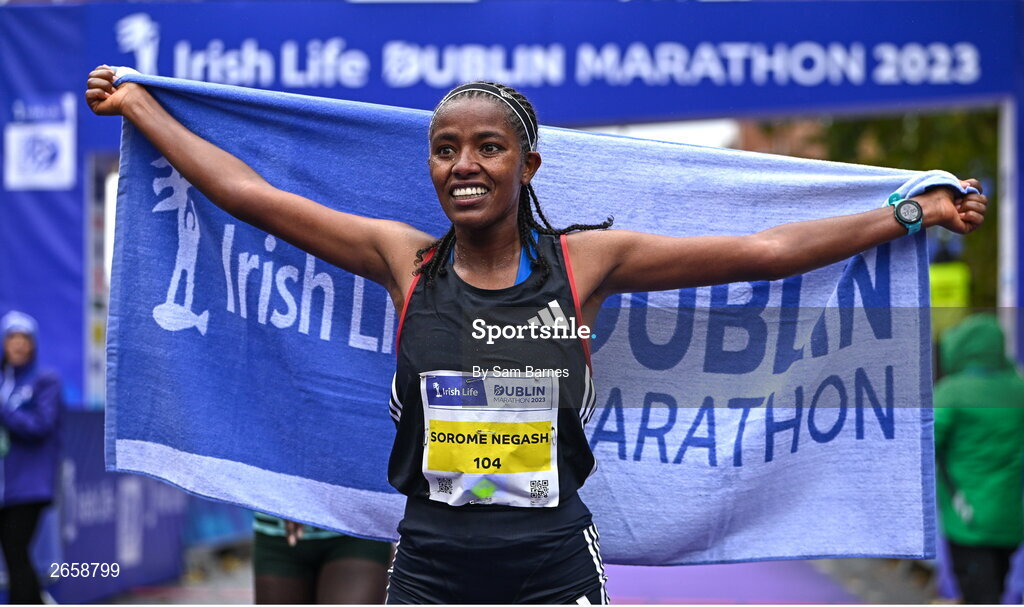 29 October 2023; Amente Sorome Negash celebrates after winning the women's event during the 2023 Irish Life Dublin Marathon. Thousands of runners took to the Fitzwilliam Square start line, to participate in the 42nd running of the Dublin Marathon. Photo by Sam Barnes/Sportsfile