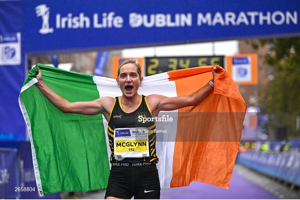 29 October 2023; Irish Women's Champion Ann-Marie McGlynn celebrates after the 2023 Irish Life Dublin Marathon. Thousands of runners took to the Fitzwilliam Square start line, to participate in the 42nd running of the Dublin Marathon. Photo by Sam Barnes/Sportsfile