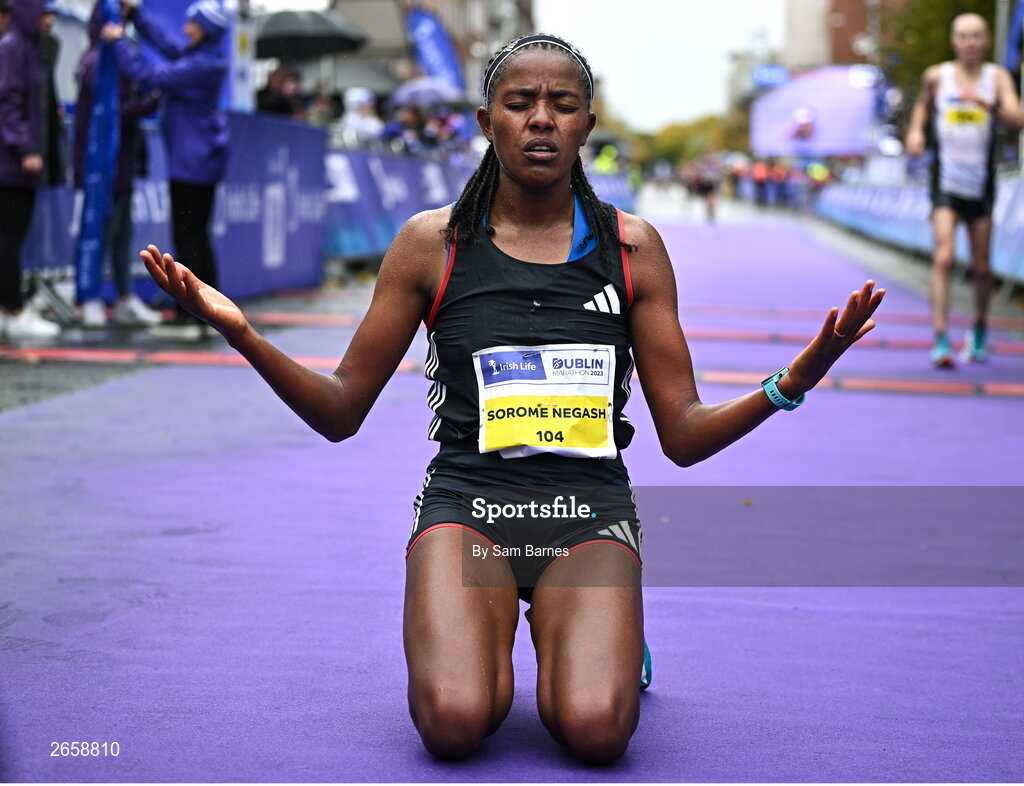 29 October 2023; Amente Sorome Negash celebrates after winning the women's event during the 2023 Irish Life Dublin Marathon. Thousands of runners took to the Fitzwilliam Square start line, to participate in the 42nd running of the Dublin Marathon. Photo by Sam Barnes/Sportsfile