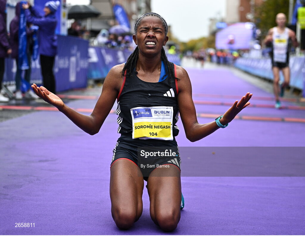 29 October 2023; Amente Sorome Negash celebrates after winning the women's event during the 2023 Irish Life Dublin Marathon. Thousands of runners took to the Fitzwilliam Square start line, to participate in the 42nd running of the Dublin Marathon. Photo by Sam Barnes/Sportsfile
