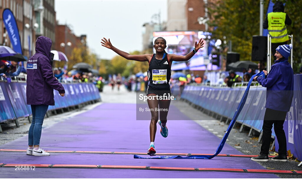 29 October 2023; Amente Sorome Negash celebrates after winning the women's event during the 2023 Irish Life Dublin Marathon. Thousands of runners took to the Fitzwilliam Square start line, to participate in the 42nd running of the Dublin Marathon. Photo by Sam Barnes/Sportsfile